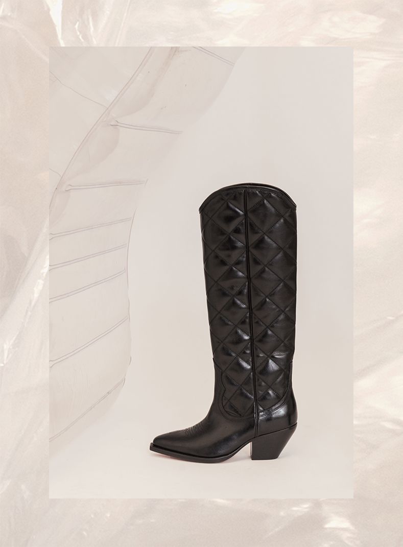 Stopping short of competing for the title of Miss Country, the look is tinged with Texan shades. Trapper-style wool overshirts and silver leather Sacha boots make their mark when paired with dresses and suits.